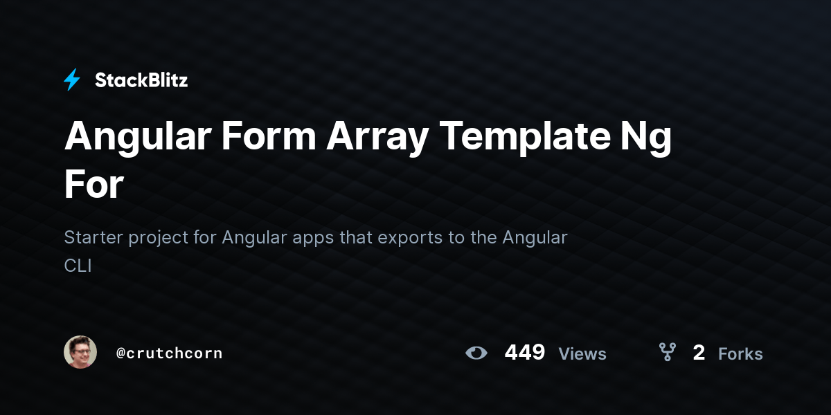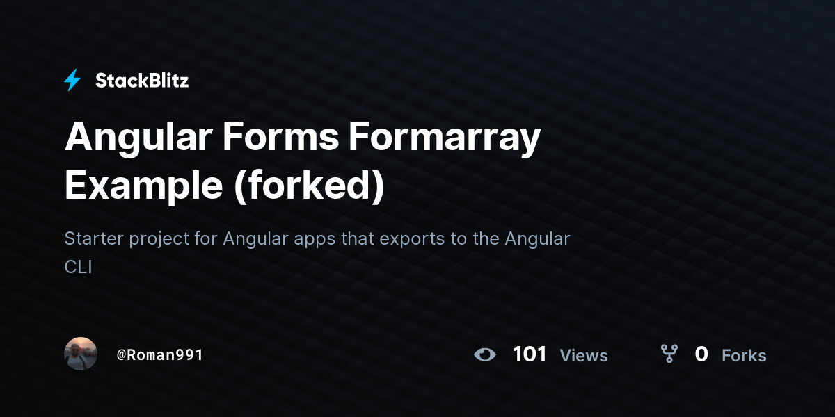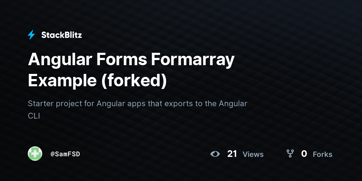 Form Array Angular Stackblitz - Web a quick example of how to build a dynamic form with validation in angular 14 using reactive forms. Starter project for angular apps that exports to the angular cli. Web angular formarray tracks the value and validity state of an array of formcontrol, formgroup or formarray. 38.0k view s 3.2k fork s. Starter project for angular apps that exports to the angular cli. Starter project for angular apps that exports to the angular cli. Web i have implemented a stackblitz where you can create a dynamic form using some configuration. Import { component, oninit } from @angular/core;